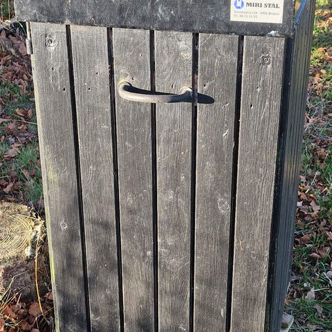 Affaldsbeholder fremstillet med en selvbærende ramme i galvaniseret vinkelstål, som diskret beskytter træet.