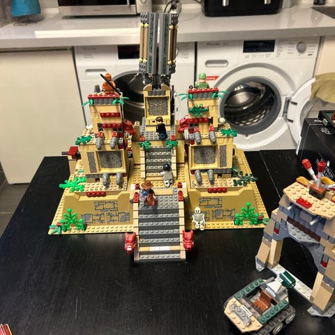 LEGO Indiana Jones bygningssæt med flere figurer og tilbehør. Indeholder en stor tempelstruktur, en båd, og flere minifigurer. Sættet er lavet af plast og er velegnet til samling og leg.