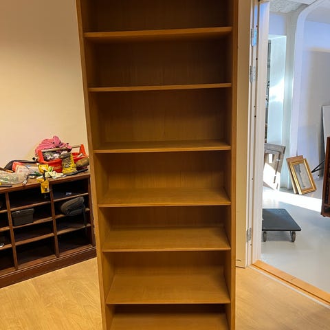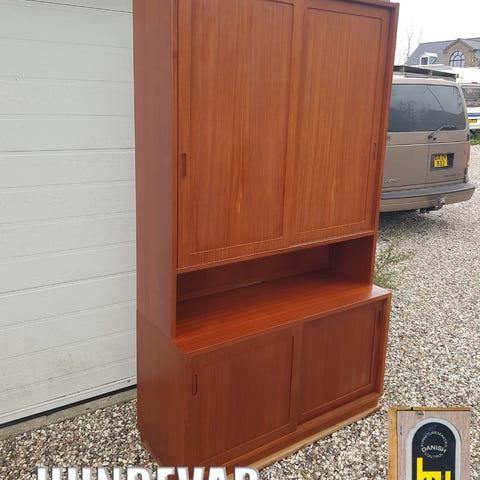 Poul Hubdevad skab fra 1960'erne lavet af egetræ. Har lys indeni og glashylder.