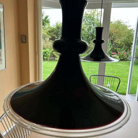 Lampeskærmene har en bred bund og en smal hals med ophængskrog. Materialet er glas med aubergine farve finish.