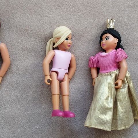 Lego Belville mand med blå shorts, blå skjorte med knapper og lommemønster, sort hår og bukser. Figuren er fra 2004.