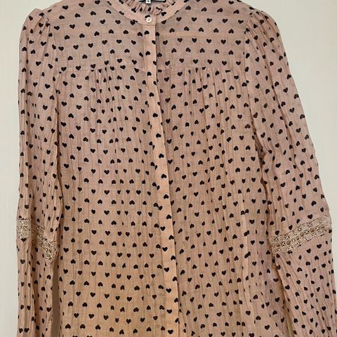 Blusen har peplum samt 3/4-lange ærmer der afsluttes med en flæse og elastikkant, hvilket giver ærmerne et sødt puffet look