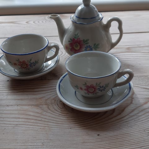 Legetøj, Mini tesæt, Mini tesæt i porcelæn til et dukkeselskab - 4 små kopper, højde ca. 3 cm. en lille tekande med låg, højde med låg ca. 5 cm. og en fin lille bakke, længde ca. 12 cm. - sættet fremstår i pæn og ubrugt stand.