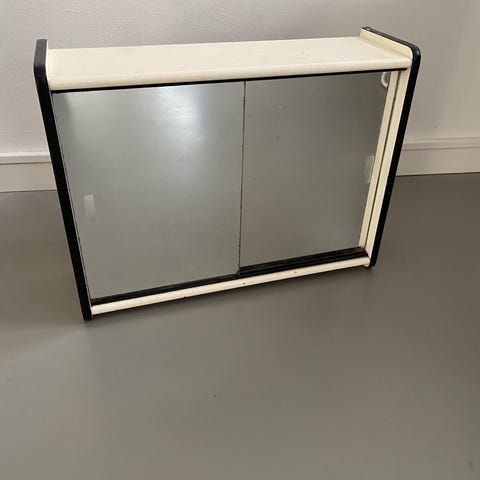 Retro toiletskab med råglas skydelåger, glas hylder og masser af patina.