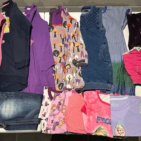 1 bluse fra Miomymio, 1 t-shirttop fra Name it, 1 par strømpebukser fra Merlin, 1 par leggings fra Mini bumps, 1 par bukser fra Drapoa dot, 1 par sommerbukser fra Miomymio, 1 kjole fra Molo og 1 kjole fra Name it. Alt dette sælges samlet for 125 kr. Jeg handler gerne MobilePay. Jeg sender gerne, hvis køber betaler for porto.