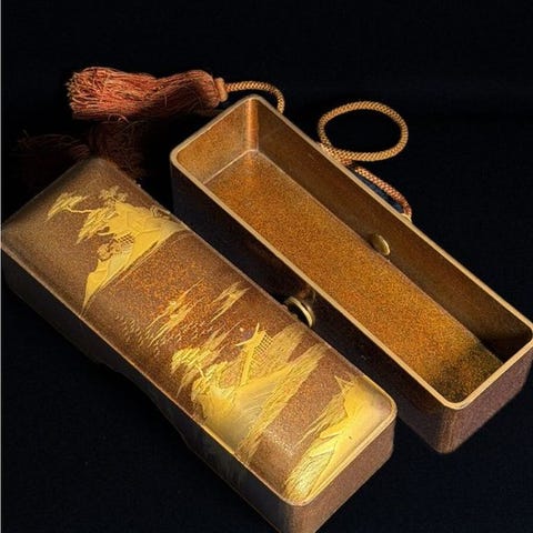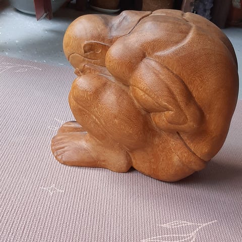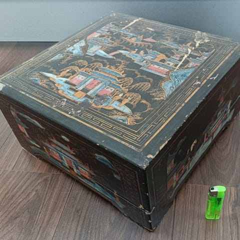 Håndmalt Buddha treboks med lokk, dekorert med et rødt og gult motiv. Boksen har en rund form og er laget av tre. Egnet for oppbevaring av små gjenstander.