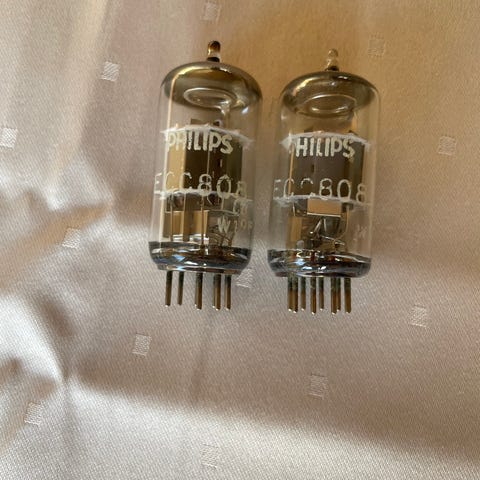 Et parrede par Philips / Miniwatt radiorør E180F med guldben