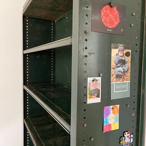 Industrielle reoler i træ og sortlakeret jern – rå patina og nordisk enkelhed.