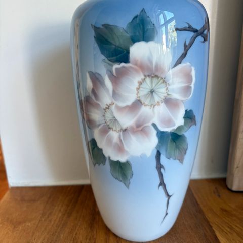 Bemærk størrelsen & prisen: Stor vase i craquelé med blomster- og gulddekoration. 1. sortering. Stemplet monogram og bølger. Ca. 26 x 26 cm.