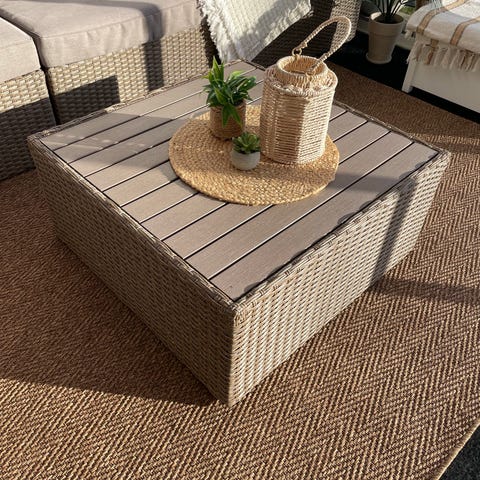 Lille havebord til loungesættet, liggestolene m.m. Er i aluminium med træ og kan bestilles i 2 farver.