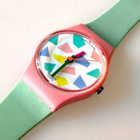 Swatch Pink Flamingo LP 100 er et vintage armbåndsur, lanceret i 1986 og repræsenterer en af de mest farverige og ikoniske modeller fra Swatchs tidlige år. Uret er et typisk eksempel på mærkets legende og grafiske designunivers, som i 1980’erne satte nye standarder for modeure med sin kombination af schweizisk præcision og popkulturel energi.