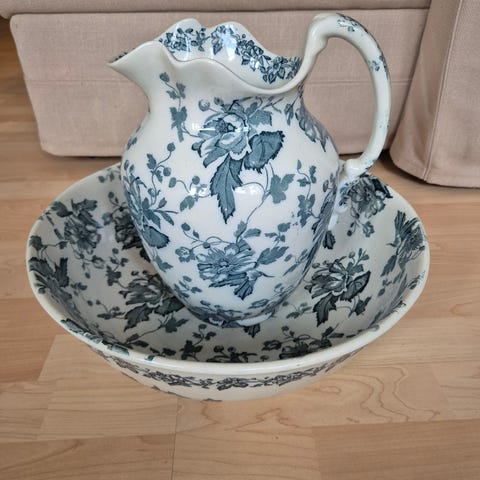 Gammelt vaskefad i emalje / god stand, fremstår meget pænt med mange blå prikker i emaljen.