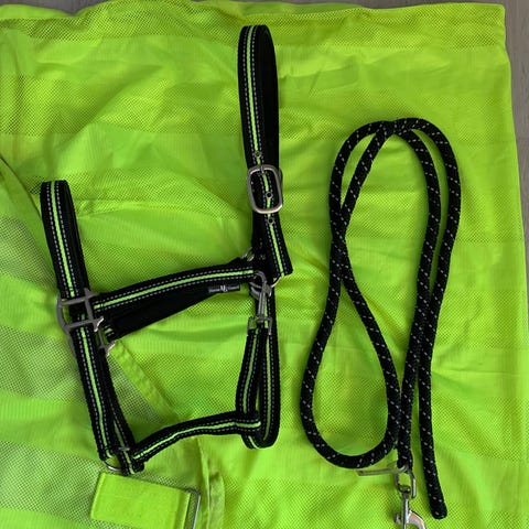 Horse Guard XF grime og træktov i blå farve. Grimen er justerbar ved både mulen og nakken. Begge ting er ALDRIG brugt. Sælges samlet. Træktorvet er LANGT, jeg har dog ikke det præcise metermål.