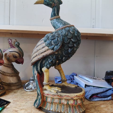 Antik påfugl i træ med farvede glaskrystaller