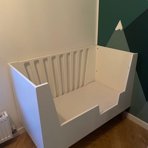Smart seng fra Done By Deer, der starter som babyseng med madrassen hævet. Senere kan madrassen sænkes, og sengen er nu en baby/junior seng. Den ene side kan tages af, når barnet bliver større, og til allersidst kan den bruges som sofa.