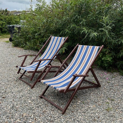 Sælger 2 brugte liggestole med nakkepuder, der kan foldes sammen, så de ikke fylder meget.
