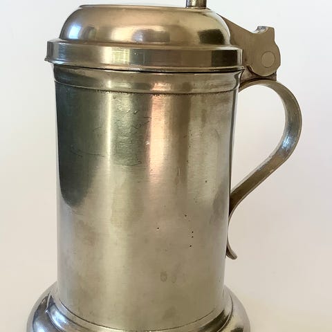 Lågkrus i tin graveret med Chr. VII monogram samt initialer og årstal “CHS MRD 1804”. Sandsynligvis en bryllupsgave. Stemplet indvendig i bunden og indvendig i låget for kandestøber Magnus Dahlgreen optaget i lauget i København 1795.