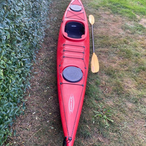 Junior kajak med ror og tilhørende pagaj af god kvalitet og et par veste og to våddragter.