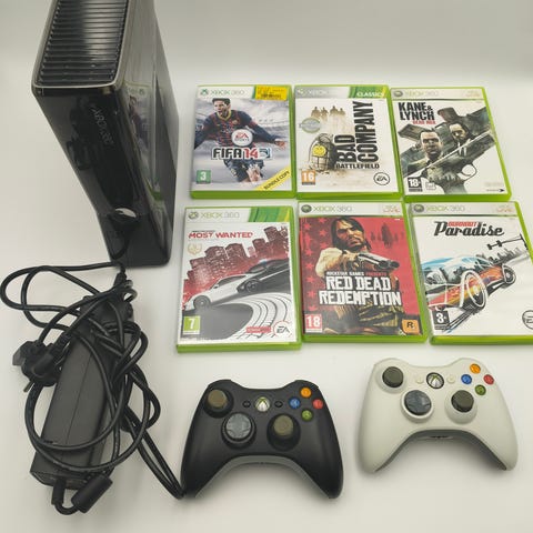 Xbox 360 spilkonsol med to controllere og 23 spil.