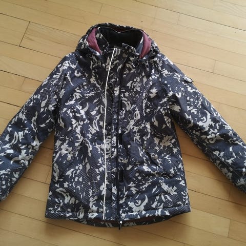 Den har aftagelig hætte med en aftagelig kant af kunstpels, er foret med fleece og har vindfang ved håndleddene.