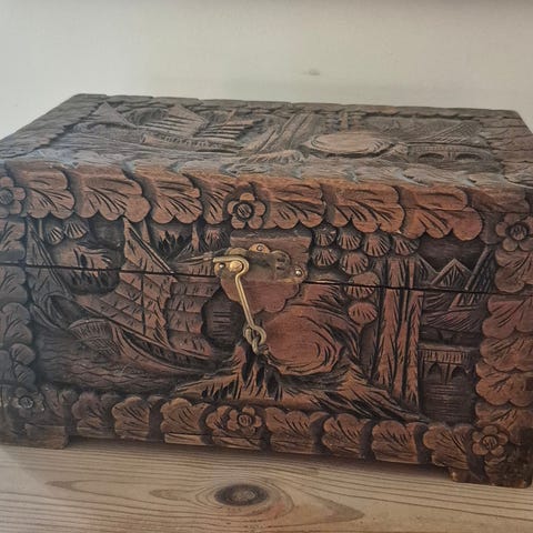 Ældre skrin af træ med messing dekoration