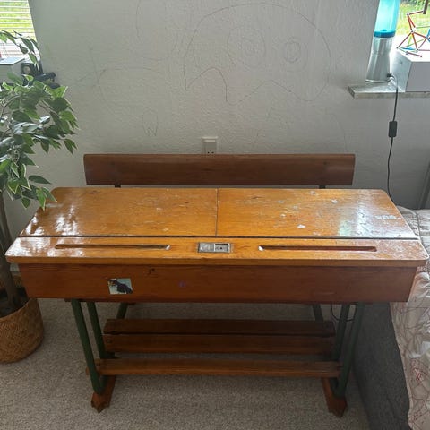 Gammel Skolebænk, Massivt træ, Flot gammel skolebænk i massivt træ. I god stand og med den helt rette kreativitet. Bordet har fordybning til skriveredskaber og blækhus. Et super dekorativt (og brugbart) lille møbel.