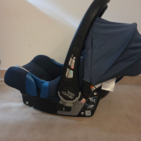 Autostolen har en blå polstring og er designet til at sikre komfort og sikkerhed for spædbørn under transport i bil. Den inkluderer en integreret sele, nyfødt indsats og en iso-fix base til nem fastgørelse i bilen.