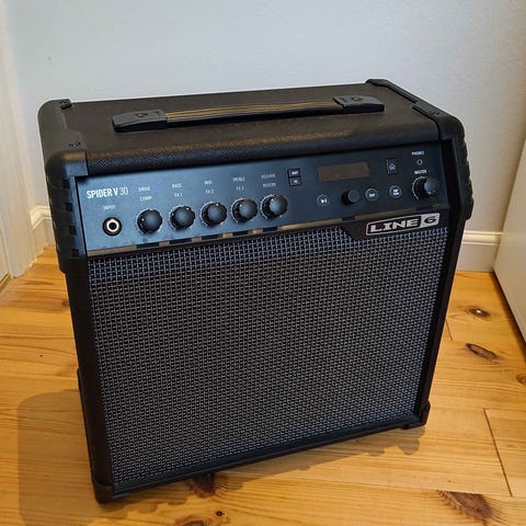 Line 6 Spider IV 15 guitarforstærker med 15 watt effekt. Forstærkeren er sort og har flere kontrolknapper til justering af lydstyrke, gain, bas, mellemtoner og diskant. Den har indgange til guitar og hovedtelefoner samt effektafdelinger til forskellige lydindstillinger. Designet med robust kabinet og bærehåndtag for nem transport.