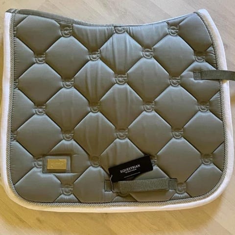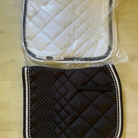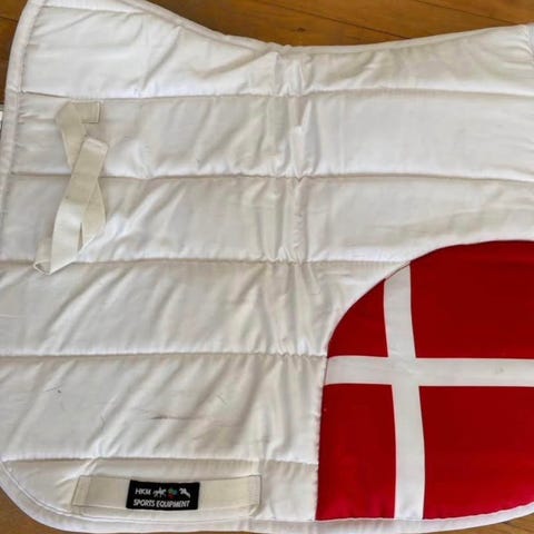 Har et hvidt dressur underlag med gej på indersiden og lidt på ydersiden og med navn på. Str 17 300 kr.