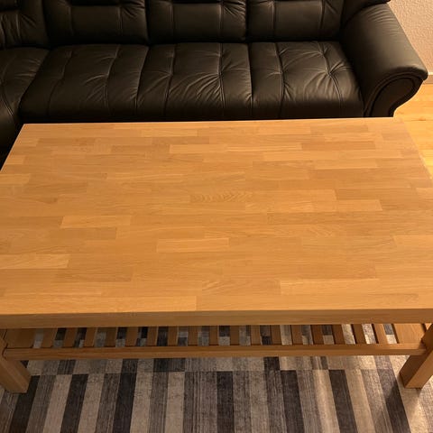 Sofabord i massivt egetræ - der er brugsspor, se fotos, men kan ordnes med en gang slibning og lakering.