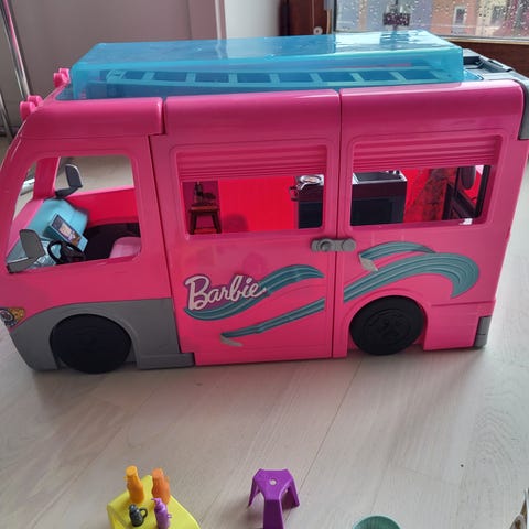 Barbie autocamper med flere indvendige detaljer, herunder badeværelse, køkken og siddepladser. Bilen har flere åbne funktioner såsom døre og tag, der kan åbnes. Båd medfølger. Kom gerne med bud