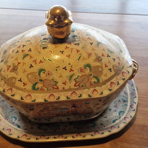 Antik suppeterrin i blå og hvid glasur