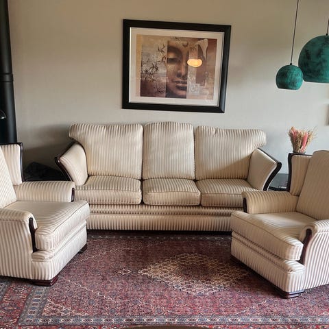 Møbelsæt bestående af to sofaer, hhv. 2- og 3-mands, og en lænestol. Desuden tilhørende sofabord.