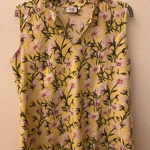 Sol-Design bluse i størrelse M til kvinder. Blusen har en gulbrun farve med et mønstret design, i fløjlslignende materiale. Den har lange ærmer og rund halsudskæring.