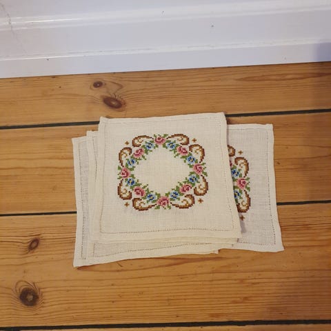 12 dækkeservietter med blomster, fint broderede i korssting. Enkelte af servietterne har enkelte aldersrelaterede petter (se fotos), men generel fin stand. Mål: 15 X 15 cm. Sælges samlet for 250 kr.