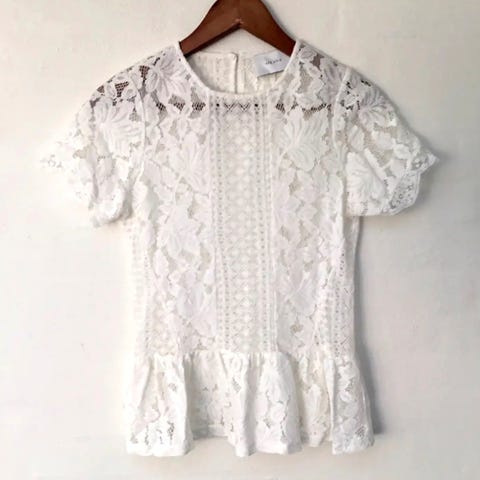 Toppen / blusen har rund hals og går ned i en smukt V med en fin blondeindsats. Dan har fine læg fra halsrundingen og ned, hvilket giver blusen et elegant look.