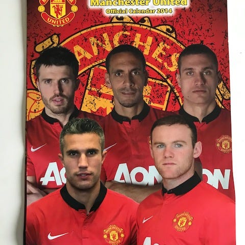 Manchester United julekort med signaturer fra holdmedlemmer. Kortet indeholder et juletræ med signaturer og en hilsen fra klubben.