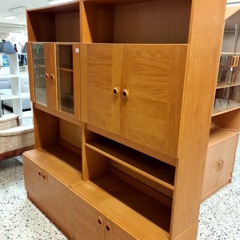 Skabet har en åben hylde med glasplader og en lukket boks nedenunder. Det er lavet af træ.,Afhentes i:,Røde Kors Aalborg (851),Bemærk at mail, chat og beskeder ikke besvares, og varen skal købes på knappen "Gå til varen"