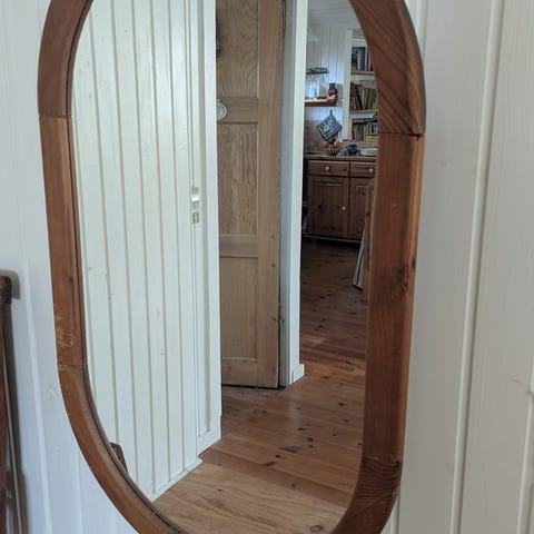 Spejlet er ovalt med en træramme. Rammen er brun og har patina.,Bemærk at mail, chat og beskeder ikke besvares, og varen skal købes på knappen "Gå til varen"