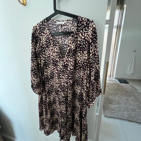 Karen by Simonsen Hverdagskjole i størrelse 44 i flere farver. Kjolen har et mønstret design med en kombination af sorte pletter på en gul og hvid baggrund. Materialet er viskose og elastan. Kjolen kan også bruges som kimono. Den er brugt og vasket en enkelt gang. Ny pris kr. 1299,-.