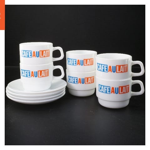 Olio olio kaffekopper og underkopper i beige keramik med brunligt mønster. Sættet indeholder fire kopper og fire underkopper. Designet er enkelt og funktionelt, egnet til servering af kaffe eller te.