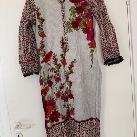 Hvid retro kjole med sommerfugle og blomster og bindebånd og lynlås foran str.L