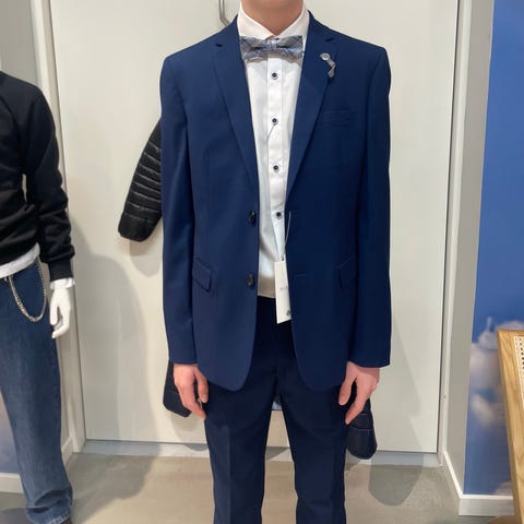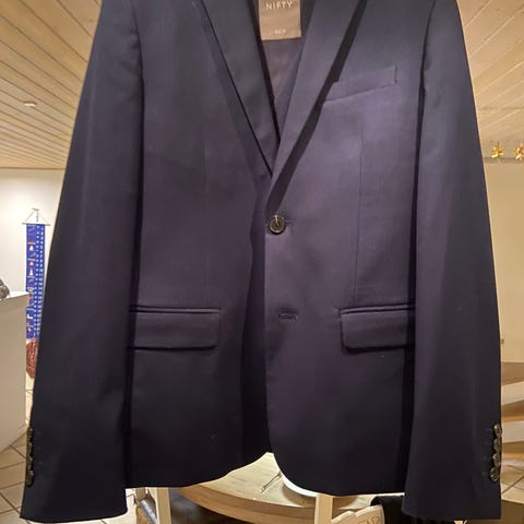 Flot konfirmationstøj. Sæt med blå jakke, blå buks, hvid skjorte, butterfly og lomme klud alt i str. 16 år fra Nifty “ Nielsens “. Brugt en gang, meget velholdt og i fin opbevaringsplads. Passer fra ca højde 165 cm og op.