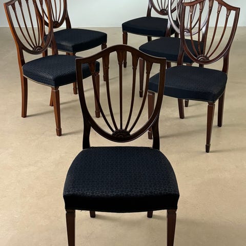 Smukt sæt med seks vintage spisestuestole i mahogni, udført i en klassisk antik stil med fine snedkerudskæringer og dekorative gyldne detaljer. Stolene har et elegant og tidløst udtryk, der passer perfekt til en traditionel spisestue, herskabelig bolig eller en moderne indretning med sans for historiske møbler.