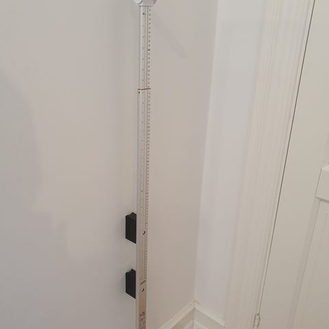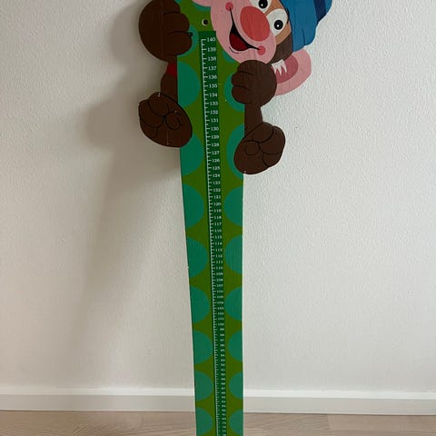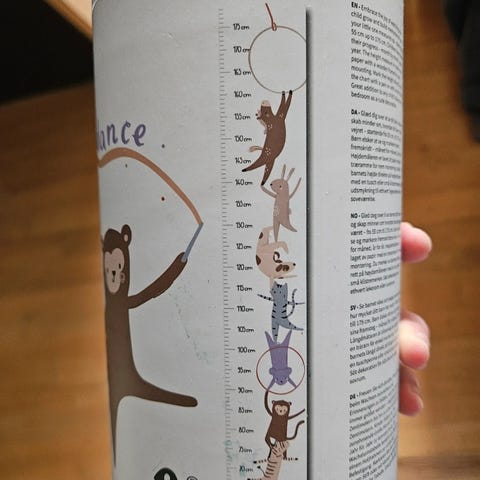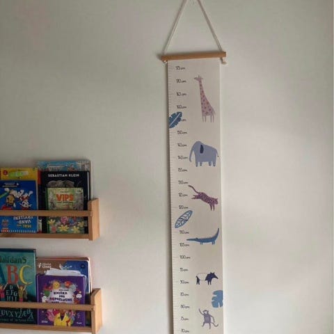 Sebra Højde Måle Chart til børn i børneværelset. Målechartet er designet til at måle børns højde og har illustrationer af dyr og balloner. Den leveres i en cylinderformet beholder med træstænger og snor til ophængning. Farven er primært hvid med farverige motiver.