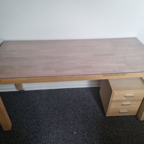 Stort massivt skrivebord i lyst eg samt sideskab og udtræksplade sælges samlet.