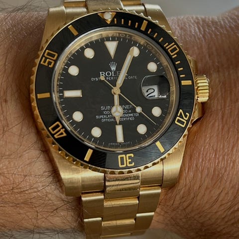 Nyeste model af Rolex Submariner her i guld/stål udgaven med sort skive og sort lynette.Uret måler 41 mm og er med automatisk optræk.