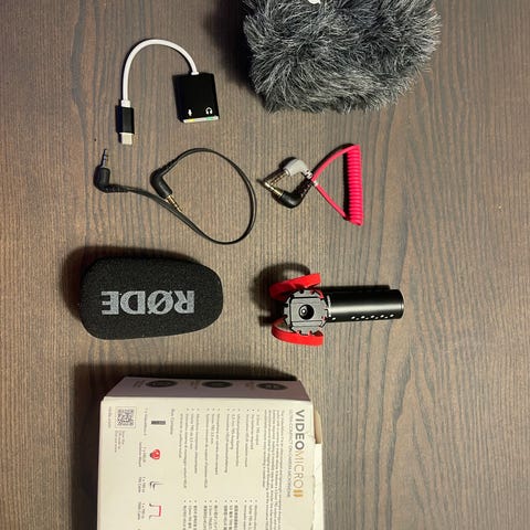 Rode VideoMic Pro Mikrofon med sort farve. Mikrofonen er designet til brug med kameraer og optagelsesudstyr, og inkluderer en beskyttelsespose. Kablet er integreret til tilslutning og brug.