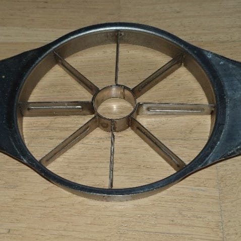 Så er det den tid på året, hvor haverne bugner af æbler. Så her er nogle af de stærke æbledelere i aluminium og stål. Den ene hedder APFELLA og er fra Wilesco. De tre ens er fra Westmark og hedder Divisorex. Pæn brugt stand.