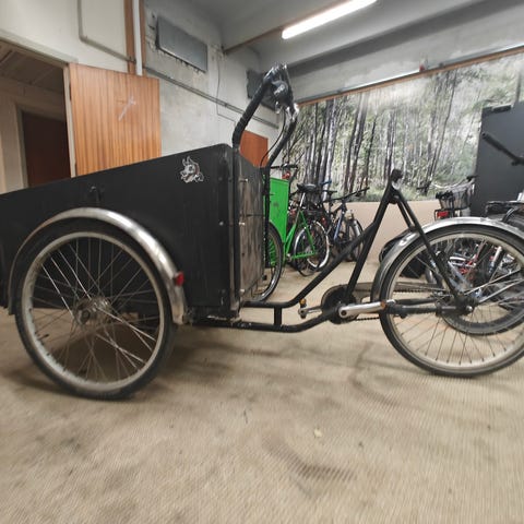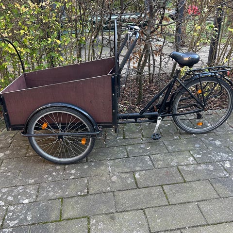 Ladcykel i god stand med plads til to børn i ladet. Ladet har bænk med pude og to seler, desuden er der skridsikker bund. Ladet kan åbnes på forsiden for nem af- og påstigning. Kaleche følger med ved udlejning. Cyklen har syv velfungerende indvendige gear, samt skivebremser foran og fodbremse bagved.